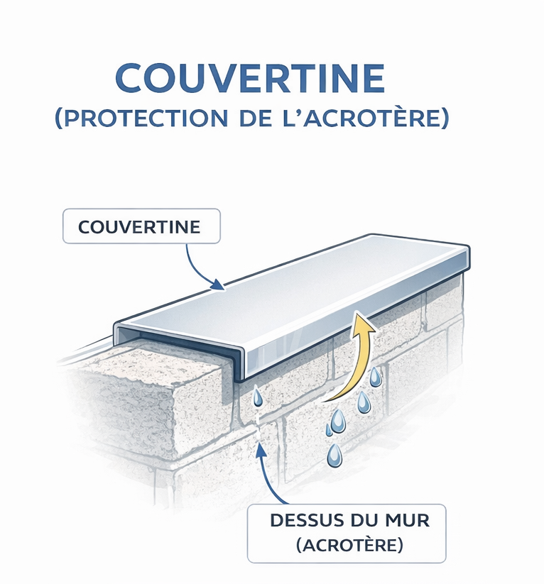 Profilés métalliques qui coiffent et protègent le sommet des murs acrotères.